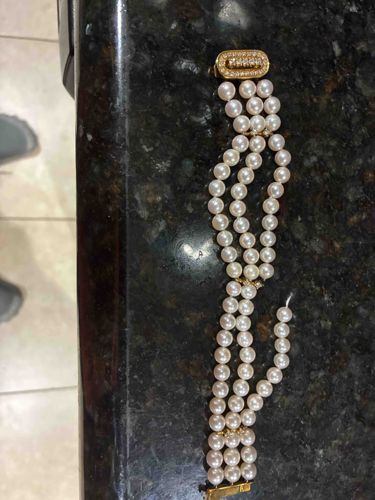This is a damaged triple-strand pearl bracelet featuring white cultured pearls. The pearls appear to be approximately 6 to 7mm in diameter, exhibiting a creamy white body color with good luster and noticeable orient. The bracelet is constructed with three parallel strands held in place by gold-tone or solid gold metal vertical spacer bars. The primary feature is a large, rectangular-oval safety clasp in yellow gold. The clasp is ornate, featuring a central row of five small round-cut stones (potentially diamonds) set within a textured raised border. The overall construction suggests a mid-to-late 20th-century vintage style, likely from the 1960s or 70s. Regarding condition, the piece is currently in a state of disrepair; the silk or nylon thread on one of the outer strands has snapped, resulting in loose pearls and an incomplete strand that requires professional restringing. The pearls otherwise appear to have a smooth surface with minimal visible pitting. The gold clasp shows light surface scratches consistent with use but maintains its structural integrity. Total length is estimated at 7 to 7.5 inches when repaired.