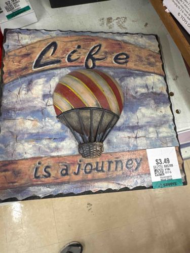 This is a square, mixed-media decorative wall plaque featuring a three-dimensional relief design of a vintage-style hot air balloon. The item is constructed from a combination of materials, likely a cast resin or composite for the balloon and lettering, mounted onto a base that mimics the texture of natural slate or distressed wood with rough-hewn, jagged edges. The color palette is muted and rustic, featuring tones of dusty blue, cream, and ochre in the background to simulate a cloudy sky. The hot air balloon centerpiece is painted with diagonal stripes of deep red, gold, and cream, supported by a dark-colored gondola and rigging. The text "Life is a journey" is presented in a stylized, bold script across the top and bottom in a contrasting dark hue. The piece exhibits intentional distressing and an antiqued patina to suggest age, though it appears to be a contemporary mass-produced decor item. Visible condition is generally fair, though there is a large retail pricing sticker from 'Savers' ($3.49) adhered to the lower right corner, which may leave adhesive residue upon removal. The craftsmanship is commercial grade, designed for home interior styling rather than fine art collection.