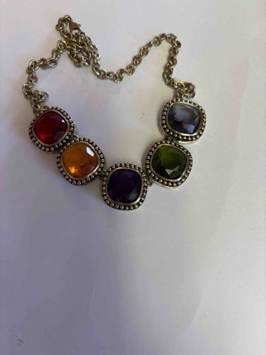 This is a contemporary fashion necklace featuring five large, cushion-cut multi-colored synthetic stones or crystals arranged in a bib-style layout. The necklace is constructed from a silver-toned base metal, possibly brass or alloy with a plated finish. Each of the five central 'gemstones'—colored in deep red, amber orange, royal purple, olive green, and smoky gray—is held within a decorative bezel setting accented with a beaded or 'milgrain' texture around the perimeter. The stones appear to be faceted crystals or high-quality resin, designed to mimic semi-precious gems like garnet, citrine, amethyst, and peridot. The pendants are linked together and attached to a substantial cable-style chain that includes a lobster claw clasp for closure. From a condition standpoint, the metal shows signs of minor oxidation and surface wear consistent with light use, particularly visible in the crevices of the beaded edging where a slight patina has developed. The facets of the stones remain crisp with no significant chips or deep scratches visible in the photograph. There are no obvious maker's marks visible on the front, suggesting it is a mass-produced boutique or high-street fashion accessory, likely dating from the mid-2000s to the 2010s. The craftsmanship is typical of costume jewelry, focusing on visual impact and color harmony rather than precious material value.