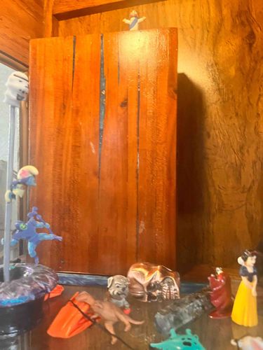 A diverse collection of small scale figurines and oddities arranged on a shelf. The central focus is a large, rectangular block of polished orange-toned wood, likely a decorative pedestal or base. This block features vertical graining and a glossy finish, showing some minor surface scuffs. Surrounding it are various pop-culture and novelty items, including a Star Wars Stormtrooper head on a pole, a Smurf figure, a blue superhero-style action figure, a small pug dog figurine, a metallic copper-finish skull, a robed red figure, a classic Snow White figurine, and a dinosaur toy. The materials range from molded PVC and hard plastic to cast resin and wood. Many of the toys appear to be mid-to-late 20th-century mass-market collectibles. The condition varies among the items: some figures show paint loss and play wear, while the metallic skull appears in relatively good condition. There is no visible maker's mark on the primary wooden block, suggesting it may be a hand-crafted or repurposed industrial artifact. This eclectic assemblage represents a personal hobbyist collection characterized by an 'I-Spy' or 'Wunderkammer' style arrangement of disparate nostalgic objects.