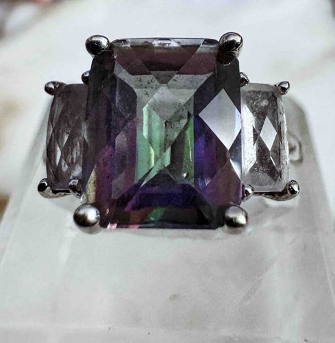 This is a statement ring featuring a three-stone arrangement set in 14kt white gold. The central focal point is a large emerald-cut Mystic Topaz, displaying a characteristic iridescent play of colors including deep violet, teal, and lime green. This central stone is flanked by two smaller emerald-cut side stones, which appear to be clear or light-colored topaz. The stones are secured by a traditional four-prong setting for the center and two-prong style ends for the side stones. The metal is indicated as 14kt white gold, which shows a reflective, bright silver-tone finish. Closer inspection reveals some surface abrasions on the table and facet junctions of the central topaz, which is common for coated gemstones of this type. The setting appears robust with thick round prongs, suggesting a modern manufacturing era, likely late 20th or early 21st century. The craftsmanship is commercial grade, designed for visual impact through the use of laboratory-enhanced 'mystic' coatings on natural topaz substrates. While no hallmark is visible in the photograph, the provided context confirms the gold purity and stone identity.