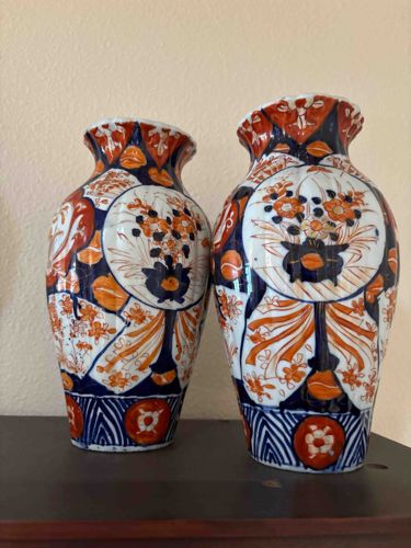 This is a matching pair of Japanese porcelain vases, likely dating from the Meiji period (late 19th to early 20th century). These vases are rendered in the classic Imari 'Kinrande' style, characterized by a sophisticated underglaze cobalt blue combined with overglaze iron-red (rust orange) and traces of gilt highlights on a white porcelain ground. The form is a traditional baluster shape with a lobed or fluted body and a slightly flared, scalloped rim. The decorative program is densely packed, featuring circular reserves (medallions) containing floral sprays, surrounded by geometric patterns, stylized cherry blossoms, and fan-like motifs. The base of each vase is decorated with a band of blue and white 'shippo' or wave-like patterns interspersed with orange floral roundels. The craftsmanship suggests a commercial export high-quality production, indicated by the symmetry and consistent application of pigments. Regarding condition, there appears to be minor surface wear consistent with age, particularly rubbing to the overglaze orange pigments and some potential kiln spotting or glaze imperfections. There are no large visible cracks or significant chips from this frontal view, though the rims show typical minor irregularities of hand-finished ceramics. The vases lack visible maker's marks in the current view, but their palette and lobed construction are quintessential of Arita-ware production meant for the Western market.
