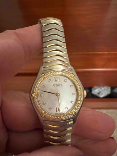 This is a luxury ladies' wristwatch by the Swiss manufacturer Ebel, specifically from the 'Sport Classique' collection, likely dating from the 1990s to early 2000s. The watch features a signature wave-link integrated bracelet executed in a two-tone brushed stainless steel and yellow gold finish. The round case is accented by a transition and bezel held by five functional gold screws, a hallmark of the Ebel brand aesthetic. The dial is crafted from iridescent mother-of-pearl, featuring gold Roman numerals at the 12 and 6 o'clock positions, while the remaining hour markers consist of small round-cut diamonds. The bezel is further embellished with a full pavé setting of small round diamonds. The watch utilizes a quartz movement, as indicated by the absence of a 'chronometer' or 'automatic' label and the 'Swiss Made' mark at the 6 o'clock position. Physically, the watch shows signs of moderate wear appropriate for its age, including light surface scratching on the metal bracelet and casing. The gold plating or solid gold components retain good luster, though some softening of the brushed finish is visible. The craftsmanship is high-end, utilizing high-quality materials and precise assembly traditional to Swiss luxury watchmaking.