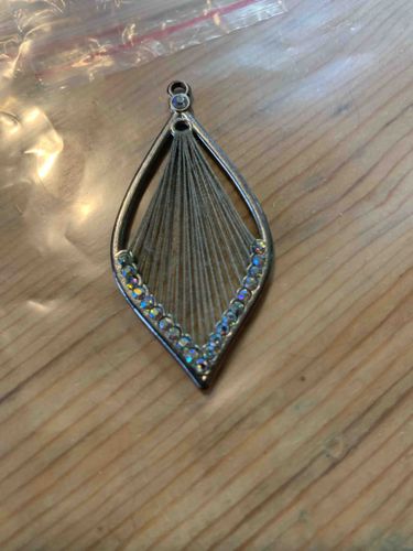 This item is a mixed-media jewelry component, likely a single earring or a necklace pendant, exhibiting a modern bohemian style. The frame is a tall, pointed teardrop or marquise-shaped metal housing with an antiqued silver or hematite-toned finish. A distinctive feature is the internal web-like structure created by fine grey or taupe thread, which is meticulously strung from a top central anchor point down to the lower V-section of the frame, creating a radial span. The lower inner edge of the frame is embellished with two rows of small, round faceted rhinestones that display an Aurora Borealis (AB) coating, providing iridescent flashes of blue, yellow, and violet. A single matching rhinestone is set at the very top of the bail loop. The metalwork shows signs of being mass-produced rather than handcrafted fine jewelry, evidenced by the slightly irregular setting of the stones. In terms of condition, there is visible minor surface tarnish on the metal frame and potential fraying or dust accumulation on the delicate threads. This piece is characteristic of early 21st-century costume jewelry, frequently found in fast-fashion boutiques or craft assembly kits.