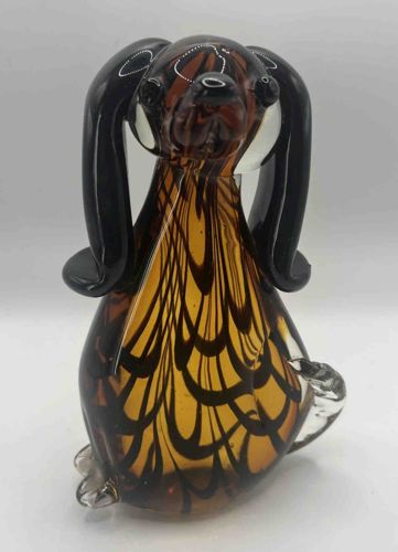 This is a hand-blown art glass figurine depicting a stylized dog, likely a Basset Hound or Beagle, characterized by its long, drooping ears and upright seated posture. The piece is constructed using an amber-toned core with a striking 'fenicio' or combed-thread pattern in dark chocolate brown, creating a wave-like decorative effect throughout the body. The ears, eyes, and nose are fashioned from solid black or deep obsidian glass, applied while hot to the main form. Small, clear glass protrusions represent the feet and a curled tail at the base. The figurine measures approximately 5 to 7 inches in height. It exhibits high-quality craftsmanship typical of mid-20th-century Italian Murano studios or similar glassworks in the Venetian tradition. The glass shows excellent clarity and light refraction, particularly through the amber transitions. Condition appears to be excellent with no visible chips, cracks, or deep scratches; however, minor base wear consistent with age is expected. No maker's mark or signature is visible in the photograph, but the style is highly reminiscent of designers like Flavio Poli or Archimede Seguso. The aesthetic blends mid-century modern playfulness with traditional glassblowing techniques.