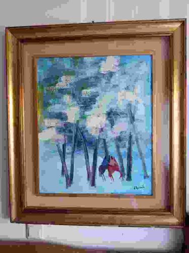 This is a mid-to-late 20th-century impressionist-style oil or acrylic painting on canvas, housed in an ornate gilded wooden frame. The artwork depicts a winter scene with tall, slender dark tree trunks set against a snowy, blue-toned background. Two small figures, appearing to be wearing red and blue coats, are seen walking along a path nestled between the trees, providing a focal point of color and human interest. The brushwork is expressive and gestural, with impasto-like texture visible in the snowy white and pastel-colored foliage above. The color palette is dominated by cool blues, whites, and greys, contrasted by the warmth of the tiny figures and the gold frame. The painting is signed in the lower right corner, though the signature is partially obscured, possibly in a cursive hand. The gilded frame features a multi-tiered cove profile with a linen liner, characteristic of mid-century gallery framing. The overall condition appears stable, though there is some visible aging on the frame, including minor nicks and a light patina. No major craquelure or paint loss is immediately evident from the image, suggesting a well-preserved piece of decorative fine art.