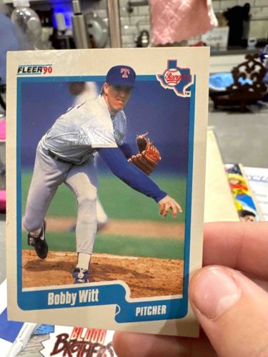 This is a standard-sized (2.5" x 3.5") professional baseball trading card from the 1990 Fleer set featuring pitcher Bobby Witt of the Texas Rangers. The card's design is characteristic of the early 1990s 'junk wax' era, featuring a white/off-white outer border and a blue inner frame surrounding an action shot of Witt in mid-delivery wearing a gray Rangers away uniform. The 'FLEER 90' logo is positioned in the top-left corner, and the classic Texas Rangers logo appears in the top-right. The player's name and position are anchored at the bottom in a blue banner style typical of the Fleer design language for that year. Constructed from medium-weight cardstock with a matte finish, the card displays relatively sharp corners though there is a perceptible slight top-to-bottom centering bias common in mass-produced sets of this period. While described as 'mint' and having been preserved for over 30 years, visual inspection shows the surface remains vibrant without significant fading. Notable for being a common card from a high-production year, its value is derived more from its nostalgic associations with the 1990s era of the sport rather than rarity.