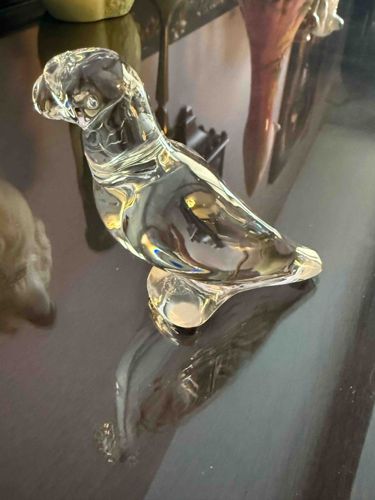 This is a premium lead crystal figurine depicting a parrot, produced by the renowned French glassmaker Baccarat. The piece is crafted from solid, high-clarity clear crystal, exhibiting the exceptional refractive index and brilliance characteristic of Baccarat's proprietary formulas. Physically, the figurine features a sleek, minimalist silhouette that captures the essence of a parrot with a curved beak, defined head crest, and long tail feathers tapering to a soft point. The construction is solid and heavy, designed to function as a decorative paperweight. It stands on an integrated crystal base that provides stability while maintaining a seamless visual flow. The surface is polished to a high mirror-like finish, free of visible mold lines, suggesting expert hand-finishing. There are no immediate signs of chips, cracks, or heavy internal inclusions, though slight shelf wear may be present on the underside of the base. Based on the mid-century modern aesthetic and Baccarat's production history, this piece likely dates from the late 20th century. The craftsmanship is evidenced by the fluid curves and the way the glass catches and bends light internally, a hallmark of superior crystal-working techniques used in the Baccarat workshops in Lorraine, France.