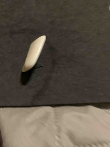 This item appears to be a small, cream or white-colored rectangular object with rounded edges, potentially a button, a badge, or a miniature electronic device. It is positioned at an angle, supported by what looks like a small black kickstand or folded backing material. The object has a smooth, matte finish and appears to be made of plastic or a similar lightweight polymer. Based on its scale relative to the fabric texture underneath, it is likely less than two inches in length. There are no visible markings, inscriptions, or manufacturer stamps on the front face, although the low lighting and slight motion blur make fine-detail identification difficult. The condition seems used but intact, with no obvious cracks or major structural damage visible from this side profile. The style is modern and utilitarian, suggestive of a common mass-produced household item or fashion accessory from the late 20th to early 21st century. The craftsmanship appears to be industrial and standardized rather than artisanal.