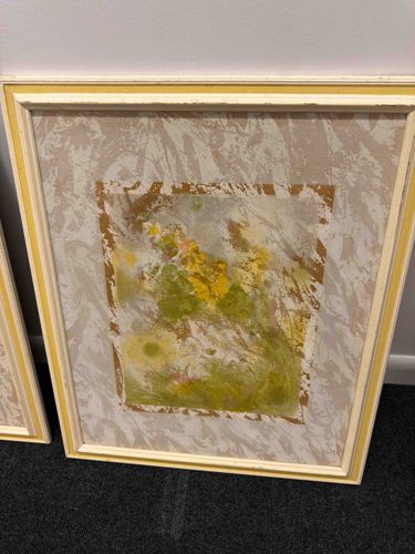 This item is a framed piece of wall art featuring an abstract floral or botanical composition. The central imagery utilizes a soft, impressionistic palette consisting of various shades of yellow, olive green, and muted pink. The artistic technique appears to involve layering, possibly through a monotype print process or a mixed media application on paper, resulting in a textured and ethereal appearance. The central rectangular image is surrounded by a wide decorative border with a marbled or sponged pattern in beige and white, creates a pseudo-matting effect. This inner border is enclosed by a recessed gold-colored frame line. The entire piece is housed in a simple wooden frame, painted in an off-white or cream color with a distinct yellow inner accent line along the moulding. Regarding condition, the frame shows visible signs of age and wear; there is noticeable paint chipping and loss along the upper edge and corners, exposing the underlying wood or substrate. The art itself appears to be protected, though potential light fading consistent with mid-to-late 20th-century decorative art is possible. There are no immediately visible signatures or maker's marks on the front surface. Based on the aesthetic style and framing materials, this piece likely dates from the 1970s or 1980s, reflecting the commercial 'hotel chic' or 'shabby chic' decor styles popular during that era.