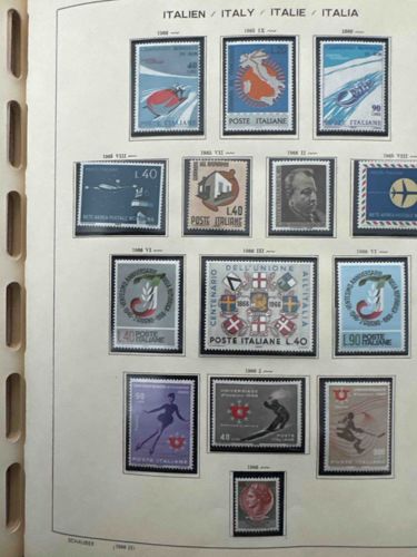This item is a single pre-printed philatelic album page featuring a collection of thirteen vintage Italian postage stamps, primarily issued around the year 1966. The page is titled 'ITALIEN / ITALY / ITALIE / ITALIA' at the top and appears to be from a specialized 'Schaubek' brand binder, indicated by the manufacturer mark at the bottom. The stamps are mounted behind clear protective hingeless mounts. The collection includes various commemorative issues such as the 1966 World Cup stamps (featuring a soccer ball and maps of Italy), the 20th Anniversary of the Republic issues, and sports-themed stamps depicting activities like ice skating and skiing. The stamps exhibit a variety of colors including vibrant blues, reds, and purples, printed using photogravure or lithographic processes on perforated paper. Notably, there is a central large square stamp celebrating the 'Centenario dell'Unione all'Italia' featuring regional heraldic shields. The page itself is a heavy-weight off-white paper stock with a reinforced ring-binder edge on the left. The condition appears excellent with no visible foxing, tearing, or creasing on the page, and the stamps appear to be in mint or high-grade used condition with crisp edges and intact perforations. This assembly represents a specific historical slice of Italian postal history during the mid-20th century.