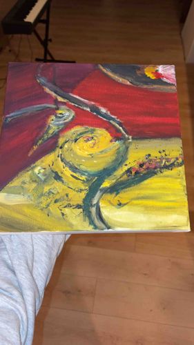 This item is an original abstract painting executed on a small-scale rectangular stretched canvas. The composition features a bold, high-contrast palette dominated by primary colors, including vibrant cadmium red, lemon yellow, and deep navy or charcoal accents. The artist utilized a heavy impasto technique, particularly evident in the swirling, circular yellow motif toward the center, which gives the piece a three-dimensional textural quality. Broad, gestural brushstrokes suggest a contemporary expressionist style, with dark, sweeping lines cutting across the crimson background. In the upper right corner, there is an inclusion of more delicate, floral-like imagery with hints of pink and white, possibly indicating a floral subject matter that has been abstracted. The painting appears to be unsigned on the front, consistent with modern experimental styles. The canvas edge suggests it is a gallery-wrapped or studio-grade pre-stretched canvas. Condition-wise, the paint layers appear stable, with no visible cracking or flaking, though there is some unevenness in the paint application which is characteristic of the expressive process. The overall craftsmanship suggests a contemporary work, likely produced within the last 20 years by an emerging or amateur artist, given the energetic but unrefined application of the medium.