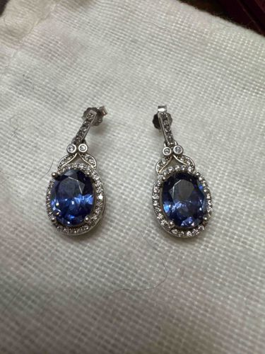 A pair of decorative drop-style earrings featuring large oval-cut faceted tanzanite stones as the central focal point. The stones exhibit a deep, saturated violet-blue hue characteristic of high-quality 'AAAA' grade tanzanite. Each primary gemstone is secured in a 4-prong setting and is surrounded by a halo of small, round-cut accent stones, likely white cubic zirconia or small diamonds. The design continues into the drop attachment, which features a vertical bar embellished with additional accent stones, connecting to the main pendant via a small ornamental bridge with scroll-like silver work. The metal is indicated as sterling silver, though it appears to have a bright, polished finish consistent with rhodium plating to prevent tarnish. The earrings utilize a post-and-butterfly-back closure. Measurement is estimated at approximately 20-25mm in total length. The craftsmanship shows contemporary industrial jewelry standards with precise pavé-style settings for the accent stones. Condition appears excellent with no visible signs of stone chipping or heavy metal oxidation, suggesting they are modern pieces, likely manufactured within the last 5-10 years. The deep saturation of the tanzanite suggests a well-sourced or carefully treated gem set.