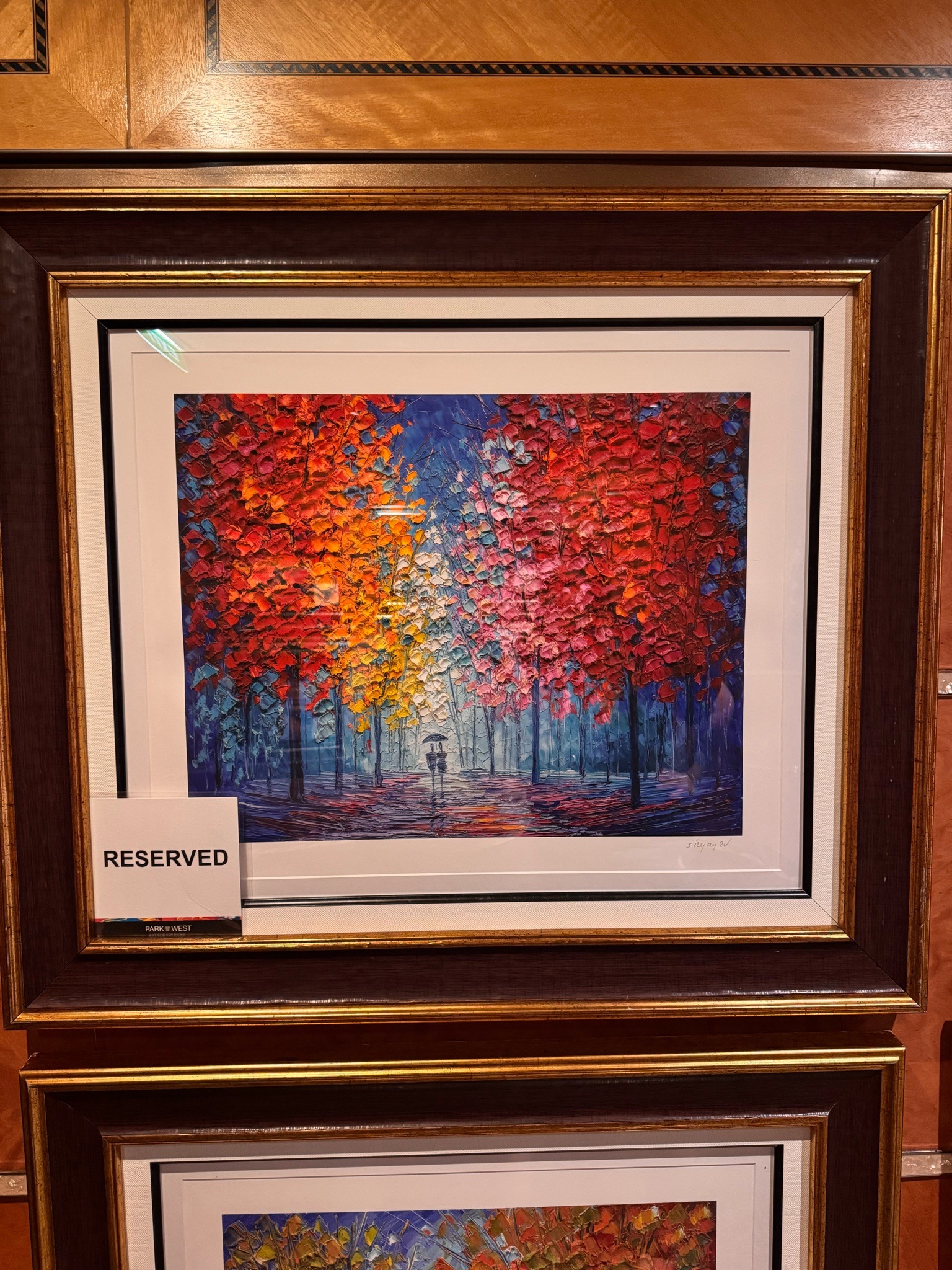 This contemporary landscape painting is executed in a heavy impasto technique, typical of the artist Anatoly Shayevich. The composition features a lone couple walking under a dark umbrella through a vibrant, park-like setting. The trees are rendered with thick, structural palette knife strokes, transitioning from fiery oranges and yellows on the left to deep reds and pinks on the right, contrasted against a cool blue-and-white background that suggests a misty or rainy atmosphere. The ground reflects the colors of the canopy above in swirling, streaky brushstrokes. A clear signature, 'Shayevich', is visible in the lower right margin within the white border, indicating it is likely a fine art lithograph or serigraph on paper, enhanced by hand-applied textures. The piece is housed in an elaborate, high-quality framing package consisting of a deep-profile dark wood outer frame with gilded inner fillets and a multi-layered white mat with a black bevel. The condition appears to be pristine, commensurate with gallery display. A 'RESERVED' sign from Park West Gallery is placed in the lower left corner, indicating its commercial provenance and current market desirability. This style is consistent with late 20th to early 21st-century contemporary impressionism.