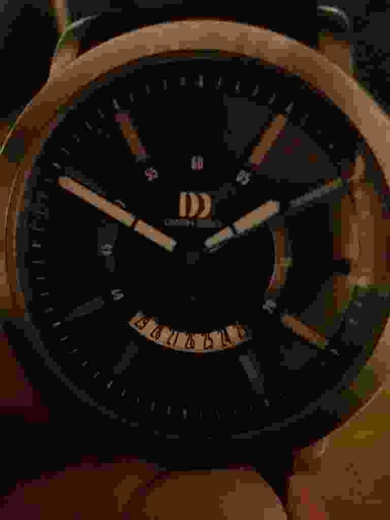 This is a modern men's wristwatch from the Dakota Watch Company, featuring a distinctive multi-layered dial design. The timepiece is housed in a round, rose-gold-toned metal case with a dark, possibly matte-black, finish on the outer bezel edge. The dial is matte black and features several unique complications, including an arched date window at the 6 o'clock position that reveals multiple dates simultaneously. It utilizes rose-gold-toned stick indices for hour markers and matching baton-style hands with white luminous inserts for low-light visibility. The 'DD' logo and 'DAKOTA' brand name are prominently displayed under the 12 o'clock position in rose gold. Construction suggests a contemporary mass-production quality, likely utilizing a reliable quartz movement. The watch crystal appears clear, though the overall condition shows light signs of use typical of a pre-owned accessory. The style is a blend of pilot and industrial aesthetics, a common design language for mid-tier fashion watches from the late 2010s to early 2020s. A black leather or high-density silicone strap is attached via standard lugs.