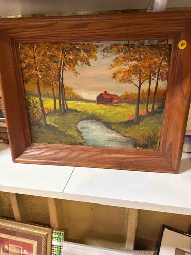 This item is an original oil painting on canvas or board, depicting a tranquil autumnal pastoral scene. The focal point of the composition is a small red farmhouse or barn nestled in a distant field, surrounded by vibrant golden and orange-hued deciduous trees. A winding stream or pond occupies the foreground, reflecting the muted sky. The work is executed in an impressionistic or folk-art style with visible, thick impasto brushwork, particularly in the foliage and grassy meadows. The color palette is dominated by earthy tones: ochre, sienna, forest green, and a splash of barn red. There appears to be a partial signature or mark in the lower right corner, though it is not clearly legible from the primary view. The painting is housed in a wide, beveled solid oak frame with a visible wood grain and a medium brown satin finish. Regarding condition, the frame shows some minor surface scuffs and dust accumulation consistent with age, while the painting surface appears stable with some potential darkening of the varnish. The style and framing suggest a mid-to-late 20th-century origin, likely created by a skilled amateur or regional artist. The piece demonstrates a charming, nostalgic aesthetic typical of American country decor.