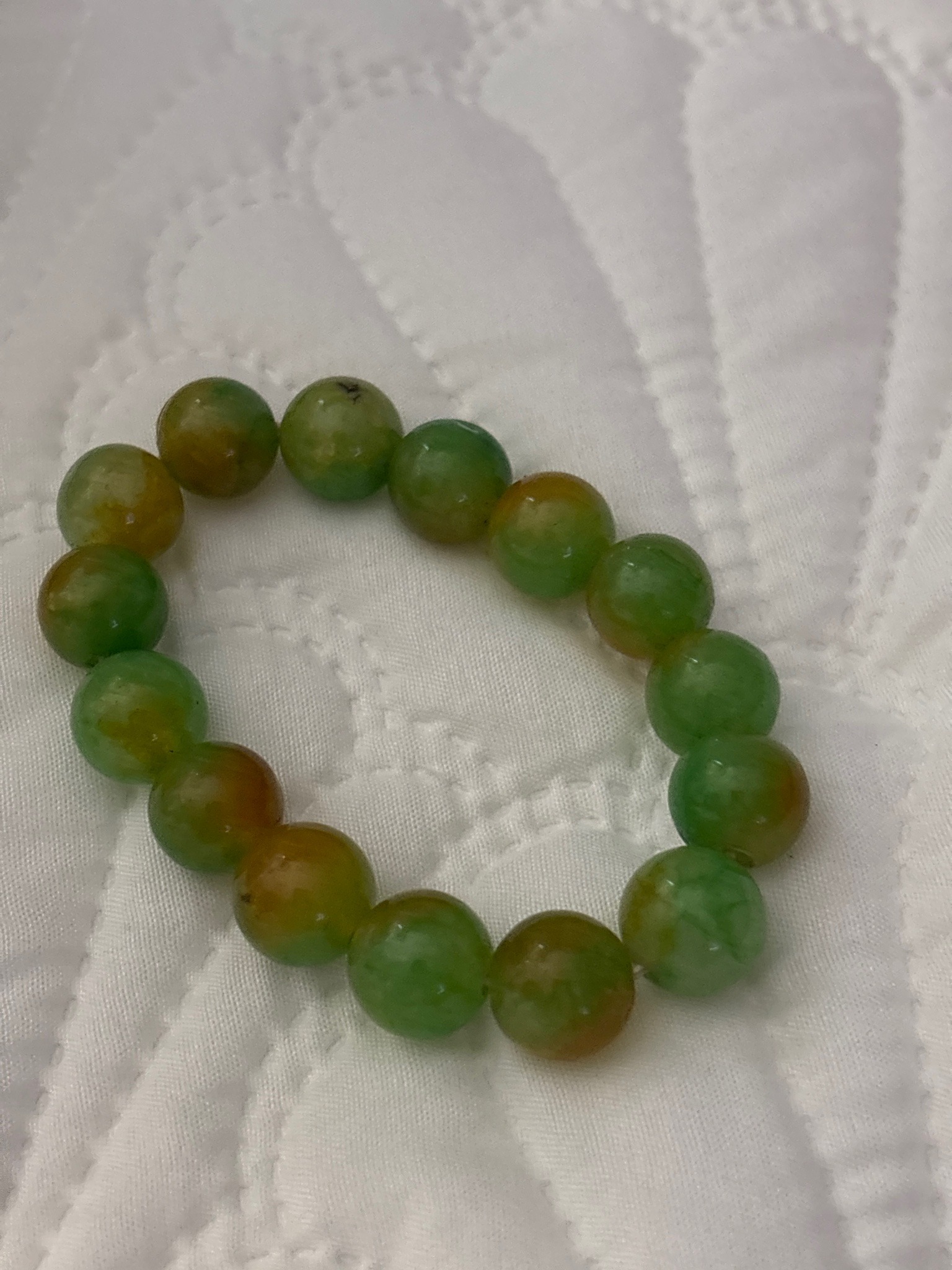 This item is a single-strand stretch bracelet composed of approximately 16 spherical beads, likely natural jadeite jade. The beads exhibit a distinctive 'moss-in-snow' and 'red-honey' color profile, featuring a range of vibrant grassy greens, translucent pale greens, and earthy russet-orange or honey hues. Each bead measures roughly 10mm to 12mm in diameter. The construction utilizes a clear elasticized cord, typical of modern high-quality lapidary jewelry, allowing for a flexible fit. The material displays characteristic jadeite traits including a vitreous to greasy luster and inherent internal textures such as fine veining and 'clouds'. One bead shows a natural dark mineral inclusion or 'spot,' which is common in untreated Grade A jade. The surface finish is highly polished with no visible cracks or significant chips, though minor surface pits may be present due to the natural stone's crystalline structure. The style is indicative of contemporary Asian jewelry design, likely manufactured in the late 20th or early 21st century. The quality of the polish and the vividness of the green and orange tones suggest a well-selected assortment of semi-translucent stones, though laboratory testing would be required to rule out polymer impregnation (B-grade) or dye treatments (C-grade).
