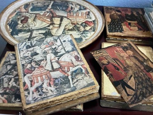 This set consists of a circular charger (platter) and two pairs of bookends, crafted in the traditional Florentine wood style associated with Roberto Ducci of Florence, Italy. The pieces are constructed from wood composites and feature the classic gesso and gold leaf (gilt) or silver-toned borders characteristic of 20th-century Italian decorative arts. The central artwork on each piece depicts Renaissance-era scenes, specifically battles and courtly life, utilizing the decoupage technique or hand-painted transfers that mimic old-world frescoes and tapestries. The color palette is dominated by muted earth tones, reds, and golds, typical of the mid-20th-century Florentine revival style (c. 1950s-1970s). The charger features an equestrian battle scene, while the bookends display knights and figures in period-appropriate attire. Condition-wise, the items exhibit a natural aged patina with visible shelf wear along the gilded edges and minor scuffing on the flat surfaces. The distressed aesthetic is intentional to provide an antique appearance, but some genuine wear is visible around the corner edges of the bookends. These pieces represent a high quality of Italian craftsmanship often found in mid-century boutique exports, functioning as both functional home decor and historical tributes to Florence's artistic heritage.