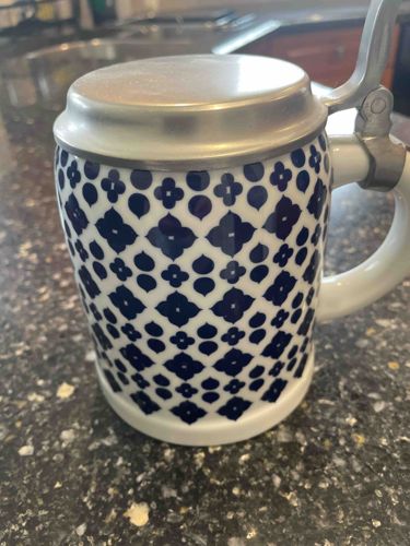 This item is a contemporary-style beer stein featuring a cylindrical ceramic body with a slight taper toward the base. The vessel's body is finished in a glossy white glaze, embellished with a repetitive geometric floral or quatrefoil pattern in a deep cobalt blue. The pattern consists of stylized four-petaled flowers and teardrop shapes arranged in a dense, uniform grid, suggesting a transfer-ware application rather than hand-painting. It is fitted with a hinged, convex metal lid, likely made of pewter or a similar zinc-based alloy, which exhibits a matte, brushed finish. The lid is secured with a traditional thumb-lever hinge mechanism attached to a white ceramic C-handle. In terms of condition, the piece appears to be in excellent used condition with no visible chips, cracks, or crazing to the ceramic glaze. The metal lid shows minor surface oxidation and light scuffs consistent with gentle handling and age. While no maker's mark is visible in the provided image, the style and clean aesthetic suggest a late 20th-century or early 21st-century manufacturing date, possibly of European origin (such as Germany) but designed for a modern market. The craftsmanship is of high commercial quality, balancing traditional form with contemporary graphic patterns.