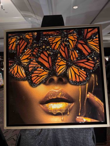 This contemporary mixed media artwork by Jay Bonadio, known as 'The Unsigned Artist', depicts a close-up portrait of a female face partially obscured by a cluster of monarch-style butterflies. The piece is characterized by a high-contrast, gold-toned color palette, where the subject's lips and skin are accented with dripping metallic gold pigment, suggesting a theme of luxury or 'Midas touch.' The composition is dominated by several orange and black butterflies that cover the upper half of the face like a mask. These butterflies appear to be embellished with crushed glass or 'shattered' diamond-like crystals, a signature technique of the artist that provides a sparkling, three-dimensional texture. The work is likely rendered on a flat substrate such as canvas or wood panel, then finished with a thick, high-gloss epoxy resin pour that encapsulates the three-dimensional elements and gives the entire piece a sleek, professional finish. The item is encased in a slim, modern silver-toned floater frame which allows the edges of the artwork to be visible. The piece displays a high level of craftsmanship in its technical execution of the resin and the intricate application of the glass shards. Based on the artist's career, this is a modern contemporary piece likely created within the last decade. The condition appears excellent with no visible yellowing of the resin or damage to the frame, maintaining its vivid saturation and reflective brilliance.