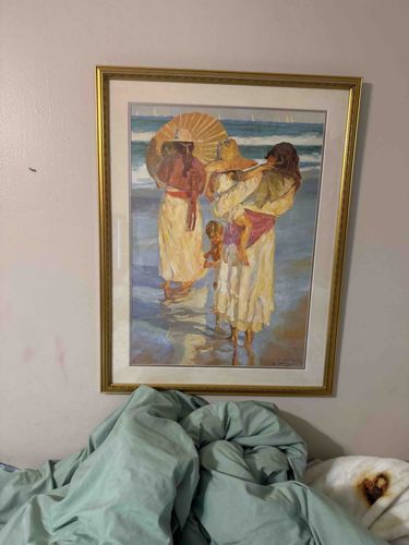 This item is a large-format framed print depicting four figures—two women and two children—walking through the shallow surf of a beach under a bright sun. The artwork is characterized by its late 20th to early 21st-century Neo-Impressionist style, prominently featuring an interplay of light and shadow, with a focus on flowing textiles and the reflective quality of water. The central figure holds a large yellow parasol, which serves as a major focal point. The color palette is composed of soft pastels, ochre, sandy beiges, and various shades of Mediterranean blue. The print is professionally matted with a white or off-white bevel-cut mat board and housed in a traditional gold-toned fluted frame with mitered corners. The signature in the lower right corner, though slightly obscured, is consistent with the works of Spanish artist Vicente Romero Redon. The condition appears stable with no visible foxing, humidity damage, or sun-fading on the image surface, though there are minor scuffs visible on the gilded edges of the frame. The use of light and the romanticized subject matter are typical of Redon’s portfolio, often intended for high-end decorative residential use.