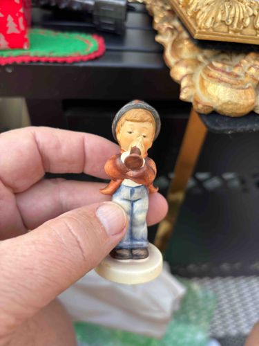 This item is a small porcelain figurine depicting a young boy playing a trumpet, characteristic of the Goebel Hummel style based on the artwork of Sister Maria Innocentia Hummel. The piece is approximately 3 to 4 inches tall and is constructed from kiln-fired earthenware with a soft, matte glaze finish. The boy is depicted wearing a grey alpine hat with a red accent, a brown jacket, and blue-tinted trousers, standing on a circular ivory-colored base. The hand-painted details exhibit the feathered brushwork and earthy, muted color palette typical of 20th-century Hummel production. Physically, the figurine appears intact without visible chips or cracks on the primary figure, though there is some light surface dust and possible slight crazing consistent with age. This specific motif, known as 'Little Gabriel,' was first modeled by Reinhold Unger in 1938. While the base's underside mark is not visible, the style and modeling suggest a mid-to-late 20th-century production. The craftsmanship is high, evidenced by the delicate molding of the hands and instrument. This piece is representative of German artisanal collectibles and popular Mid-Century home decor.