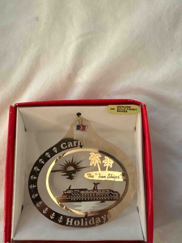 This is a vintage commemorative Christmas ornament produced for Carnival Cruise Line, specifically identifying the MS 'Holiday' ship. The item is constructed from thin, etched brass and features a dual-layer, three-dimensional medallion design. It possesses a high-polish '24k gold finish' as indicated by the original retail sticker on the inner packaging. The ornament is circular with a flat base, featuring an outer ring etched with a pattern of anchors and the text 'Carnival' and 'Holiday'. The center cutout contains a detailed silhouette of a cruise ship below two palm trees and a setting sun, accompanied by the slogan 'The "Fun Ships"'. A small enameled flag logo is visible at the top suspension point. The item is presented in its original square red gift box with a white cardboard insert. Condition appears to be excellent, retaining its original metallic luster with no visible corrosion or bending. The style and ship iconography suggest a manufacturing date between the mid-1980s and the 1990s, during the prime operational years of the MS Holiday. The craftsmanship utilizes precision acid-etching to achieve fine detail in the ship's decks and the rays of the sun.