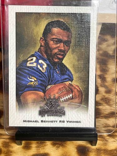 This is a 2001 Donruss Gridiron Kings trading card featuring Michael Bennett, a running back for the Minnesota Vikings. The card is a standard 2.5 by 3.5-inch sports card, characterized by its unique 'canvas-style' textured finish that mimics the look of an oil painting. The portrait depicts Bennett in his purple and gold Vikings home jersey, number 23, clutching a Wilson football. The background has an impressionistic, mottled olive-green and gold aesthetic. A notable feature is the 'Gridiron Kings by Donruss' foil stamp at the bottom center, which includes a crown motif. The player's name and position are clearly printed in a stylized black font below the image. The card is set within a thick white border that highlights the textured surface of the cardstock. Regarding condition, the card appears well-preserved inside a clear top-loader sleeve, with sharp corners and straight edges visible through the plastic. There is no obvious surface wear, though there is a slight horizontal line or mark near the bottom of the jersey illustration that may be a print defect or a minor surface scratch. The craftsmanship is typical of high-end early 2000s sports collectibles, prioritizing artistic presentation over standard photography.