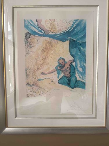 This item is a framed woodcut print on paper by the Spanish surrealist master Salvador Dalí, from his monumental 'Divine Comedy' suite. The artwork illustrates a scene from Dante Alighieri’s Purgatory, specifically the ninth Canto. Physically, the piece features a vibrant palette dominated by cerulean blue drapery against a stippled, golden-tan background. The composition depicts highly stylized, muscular figures rendered with Dalí's characteristic fluid lines. In the lower right corner of the paper, a hand-signed pencil signature by Salvador Dalí is visible. The piece is housed in a contemporary double-mat and a silver-toned metallic frame with a gold inner fillet, reflecting a late 20th-century professional framing style. The print itself appears to be in very good condition with no visible foxing, tears, or significant fading, though it should be examined out of the frame for paper acidity or hinges. This series was originally commissioned by the Italian government in the 1950s and completed in the early 1960s. The craftsmanship of the woodcut blocks, which required precise registration for multiple colors, represents a high point in 20th-century printmaking. Notable features include the delicate stippling used to create texture in the background and the dramatic, flowing movement of the blue cloth which frames the central figures.