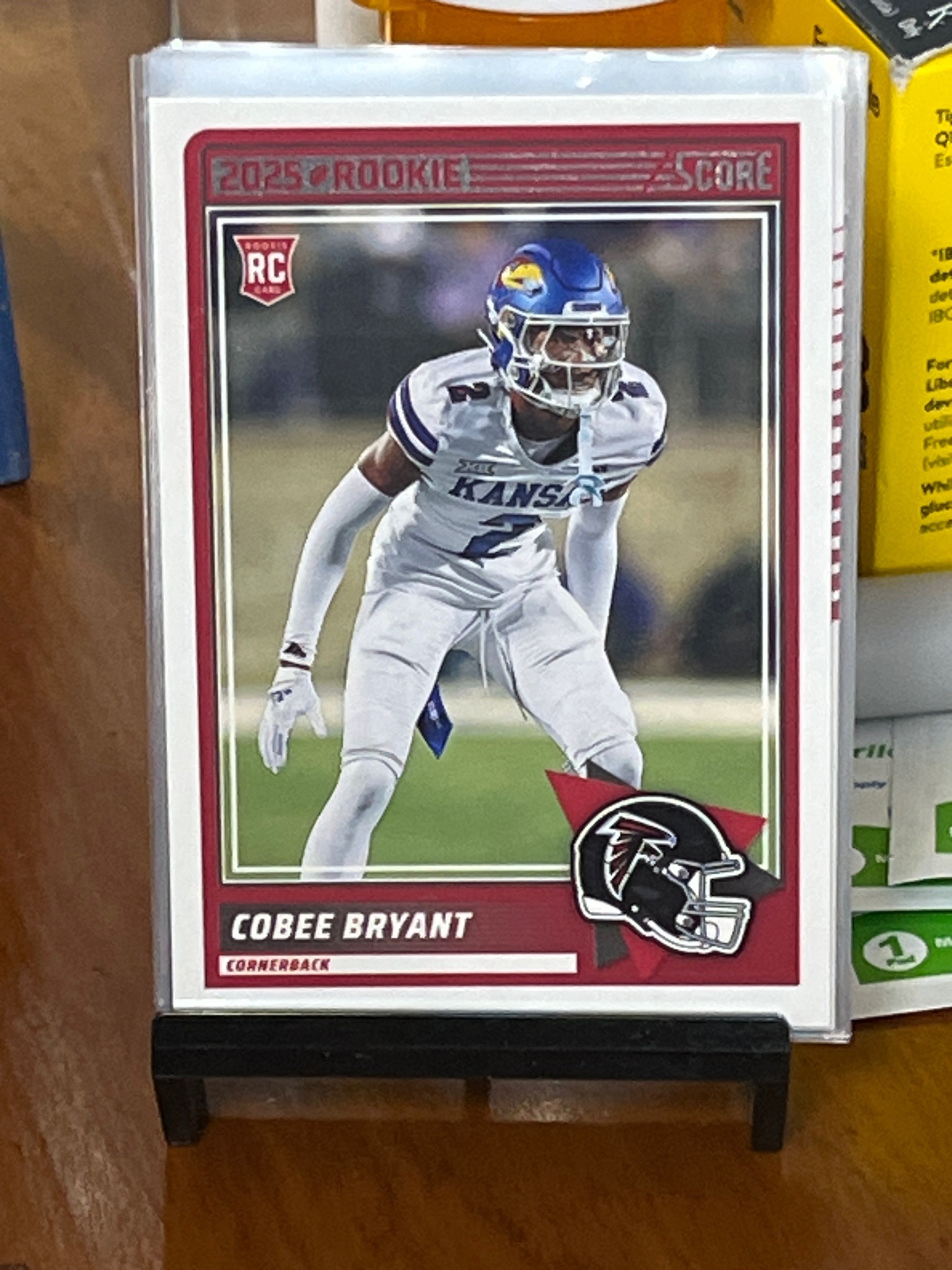 This is a 2025 Panini Score football trading card featuring cornerback Cobee Bryant. The card design utilizes a red border aesthetic typical of the Score set, featuring a full-action photograph of Bryant in his Kansas Jayhawks collegiate uniform (white jersey with blue accents and a blue helmet). Notable branding includes the '2025 ROOKIE' and 'SCORE' logos at the top, along with a prominent 'RC' (Rookie Card) badge in the upper left corner. A stylized Atlanta Falcons helmet logo is positioned in the bottom right corner, indicating his professional team affiliation. The card displays a standard 2.5 by 3.5-inch rectangular format with white cardstock borders. It is currently housed in a clear protective plastic top-loader, which appears to be in good condition. The card itself shows sharp corners and clean edges through the protector, with no visible surface scratches, creases, or manufacturing defects such as printing lines or centering issues from this frontal perspective. The quality of the printing shows high-fidelity color saturation and crisp text. As a modern sports card, its value is derived from the player's future professional performance and the card's specific parallel or rarity within the 2025 Score set.