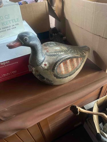 This is a large, hand-painted ceramic sculpture of a duck, executed in the traditional Tonalá style from Jalisco, Mexico. The piece is constructed from burnished earthenware (barro bruñido), featuring a smooth, semi-matte finish. Physically, the sculpture depicts a rounded, stylized waterfowl with an elongated neck and a slightly curved bill. The color palette is characteristic of the region, utilizing earthy tones including charcoal grey, cream, terracotta, and muted sage green. The decorative scheme is intricate, showcasing traditional 'flor de Tonalá' (Tonalá flower) motifs, stippled feather patterns, and a prominent fish or owl-like motif integrated into the wing area. The craftsmanship is evident in the fine line-work and symmetrical balance of the painted elements. Notable features include the white-rimmed eyes and the textured, cross-hatched pattern within the wing section. Stylistically, this piece likely dates to the late 20th century, specifically between the 1970s and 1990s. The condition appears fair to good; there is visible surface wear, particularly around the chest and beak, and significant dust accumulation suggests long-term storage. There are some minor scuffs and potential small chips along the lower edge and on the tail, consistent with handling. No clear maker's signature is visible in the photograph, though these are typically signed 'Mexico' or with the artist's name on the underside. The scale is substantial, as seen by its comparison to the neighboring 10-quart kettle box, making it a significant decorative statement piece of Mexican folk art.