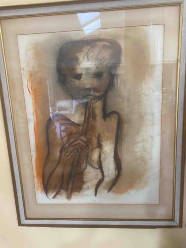 This is a framed figurative artwork of a female figure, likely rendered in charcoal and pastel or chalk on paper. The piece features a gestural, expressionistic style with a limited color palette of burnt sienna, earthy browns, and smoky blacks, accented by white highlights for form. The figure is depicted with a simplified, almost ethereal face and is holding what appears to be a flute or vertical instrument. The execution suggests a mid-20th-century origin (circa 1950s-1970s), characterized by soft, blended transitions and bold, sweeping outlines that emphasize fluid movement rather than anatomical precision. The artwork is housed behind glass in a tiered wooden frame with a gold-toned inner fillet and a light-gray painted outer profile that exhibits some minor surface wear and age-related patina. Visible scuffs are present on the frame edges, and some minor discoloration or foxing may be present on the matting and paper, consistent with age. This work demonstrates a high level of draftsmanship through its confident use of negative space and atmospheric shading, typical of post-war figurative modernism.