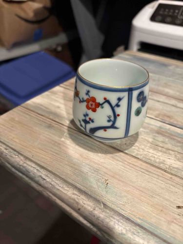 This is a fine Japanese porcelain teacup, specifically a handleless 'yunomi' style used for daily tea consumption. The vessel is constructed from white porcelain with a slightly tapered, rounded body and a footed base. The exterior features traditional underglaze cobalt blue (sometsuke) combined with overglaze polychrome enamels (aka-e). The primary motif includes red plum blossoms (ume) on a gnarled blue branch, a symbol of resilience, and stylized floral medallions or kiku (chrysanthemum) patterns in blue and green. A fine gold-gilt band accents the rim, indicating a higher level of craftsmanship. The glaze is smooth and reflective with a translucent quality characteristic of Arita or Imari ware. In terms of condition, the piece appears well-preserved with no visible chips or cracks. There is very minor wear to the gold gilding on the rim, consistent with age and occasional use. Based on the style and glaze application, this piece likely dates from the late Showa to early Heisei period (late 20th century). The integration of traditional Shochikubai-style motifs with modern precision suggests it was produced by a quality manufacturer in the Saga Prefecture region.