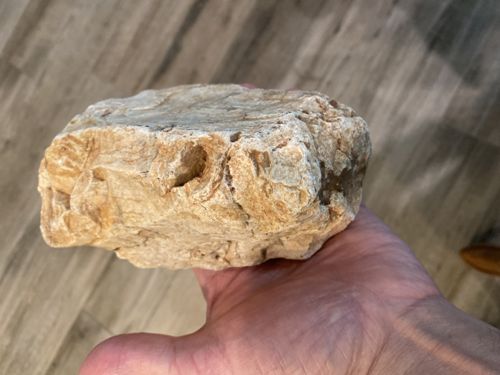 This item is a 5-inch by 2-inch bifacially worked lithic core, identified as being sourced from Guthrie, Oklahoma. The artifact is composed of a dense, sedimentary or metamorphic stone material, displaying a range of earthy tones including tan, cream, and ochre-brown. Its construction shows clear evidence of percussion flaking, with visible flake scars, ridges, and pits where material was intentionally removed from both sides (bifacial) to create a workable edge or to reduce the mass. The shape is somewhat ovate and robust, designed to fit within the palm of the hand, which is consistent with early stone tool precursors or multi-purpose core tools. Regarding condition, the piece shows significant weathering and a developed patina, suggesting substantial geological age. The edges appear somewhat blunted by natural erosion or use-wear over time. There are no modern maker's marks or signatures, as it is a prehistoric lithic remain. The craftsmanship reflects a utilitarian approach to stone reduction rather than fine pressure-flaking found in later projectile points. This piece serves as a primary example of pre-form technology, used either as a heavy scraping tool or as a source of raw material for smaller flakes. The surface shows some geological mineralization and micro-pitting, which are characteristic of items found in Oklahoma's specific soil chemistry.