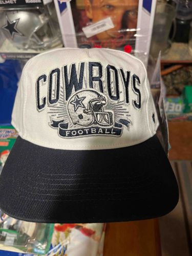 This is a vintage-style Dallas Cowboys snapback hat, featuring a two-toned color scheme with a white crown and a dark navy blue brim. The front panel showcases a large, high-density embroidered graphic including the word 'COWBOYS' in a block-serif font, an illustration of a football helmet with the iconic star logo, and a banner below reading 'FOOTBALL'. The embroidery is executed with multi-layered stitching in navy and silver-grey threads. The hat appears to be a structured six-panel design, typical of sportswear from the 1990s or early 2000s. While 'Roddy White' was mentioned in the prompt, there is no visible signature on the front crown or brim of this specific item in the provided image. The fabric shows a clean, crisp texture with no immediate signs of sweat stains, fraying, or significant UV fading, suggesting it has been kept in a collector's environment. The stitching on the visor is even and parallel, indicating standard licensed apparel quality. The overall condition is excellent, preserving the sharp contrast between the white textile and the dark navy embroidery and brim.