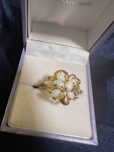 This is a decorative cocktail ring featuring a cluster of approximately six oval cabochon-cut white opals, accented by several small round-cut clear stones, likely cubic zirconia or glass. The opals exhibit a milky white body color with subtle hints of play-of-color, though they appear somewhat dehydrated or opaque in the current lighting. The stones are secured in a yellow gold-toned metal setting, characterized by an ornate, fluid design with ribbon-like scrolls and textured detailing along the outer edges of the face. The construction appears to be cast metal with a gold plating or high-polish finish. The overall condition shows signs of moderate wear, particularly on the gold finish which appears thinning on the prongs and inner shank. The presentation box includes the branding 'Goldmark' on the inner silk-style lid lining; Goldmark is a well-known commercial Australian jewelry retailer, suggesting this is a contemporary mass-market piece, likely from the late 20th or early 21st century. The craftsmanship is standard commercial grade with simple prong settings. Notable staining or slight surface grime is visible on the ring's setting and the interior fabric of the presentation box, which may require professional cleaning to restore luster.
