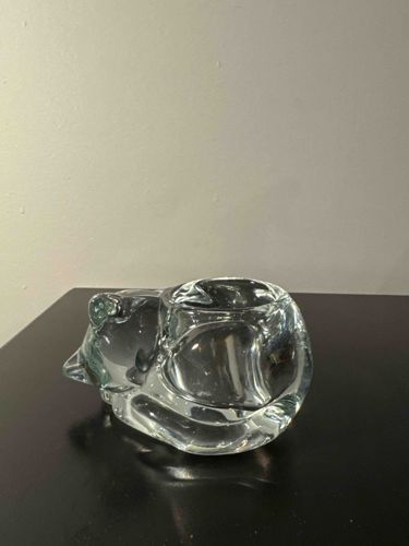 This is a heavy, solid-body decorative glass figurine depicting a curled, sleeping cat. The item is crafted from high-clarity clear lead crystal or art glass, measuring approximately 4-5 inches in length. It features a minimalist, mid-century modern aesthetic with fluid, organic lines and a polished smooth surface. The cat's form is stylized with subtle protrusions for the ears and a rounded tail tucked against its body. Centered in the back of the cat is a circular indentation designed to hold a standard tea light or votive candle. From a condition standpoint, the glass appears bright with no immediate signs of clouding or 'glass sickness,' though minor surface scratches and shelf wear on the base are typical for its age. This style is highly characteristic of Finnish or Scandinavian glassmakers such as Iittala or Riihimaki, often produced during the 1970s or 1980s. The solid construction and refractive quality indicate high-quality craftsmanship, likely intended as both a functional luminary and a paperweight or desktop sculpture.