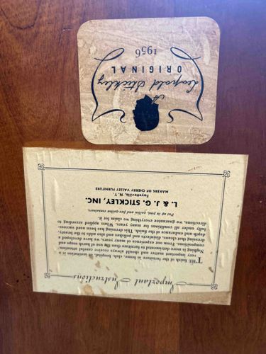 This item is a piece of American mid-century wooden furniture, specifically part of the 'Cherry Valley' collection produced by L. & J. G. Stickley, Inc. in Fayetteville, N.Y. The image shows the underside or back of the piece, featuring two distinct primary labels. The upper label is a 'Leopold Stickley Original' brand mark dated 1956, featuring his silhouette. The lower label is a larger paper instructional tag titled 'Important Instructions' regarding the care and maintenance of the finish. The wood exhibits a warm, medium-brown horizontal grain, consistent with cherry wood, which was the hallmark of this specific line. The craftsmanship is indicative of high-quality mass production from the 1950s, emphasizing durability and traditional American styling. Condition-wise, the labels show typical age-related yellowing and slight peeling at the edges, particularly on the instruction tag. The wood surface visible in the photograph appears well-maintained with a smooth finish and minimal scratching, indicating a well-preserved example from this mid-century period. These labels are crucial for provenance, confirming the piece was manufactured during the peak of the Cherry Valley line's popularity under Leopold Stickley's direction.