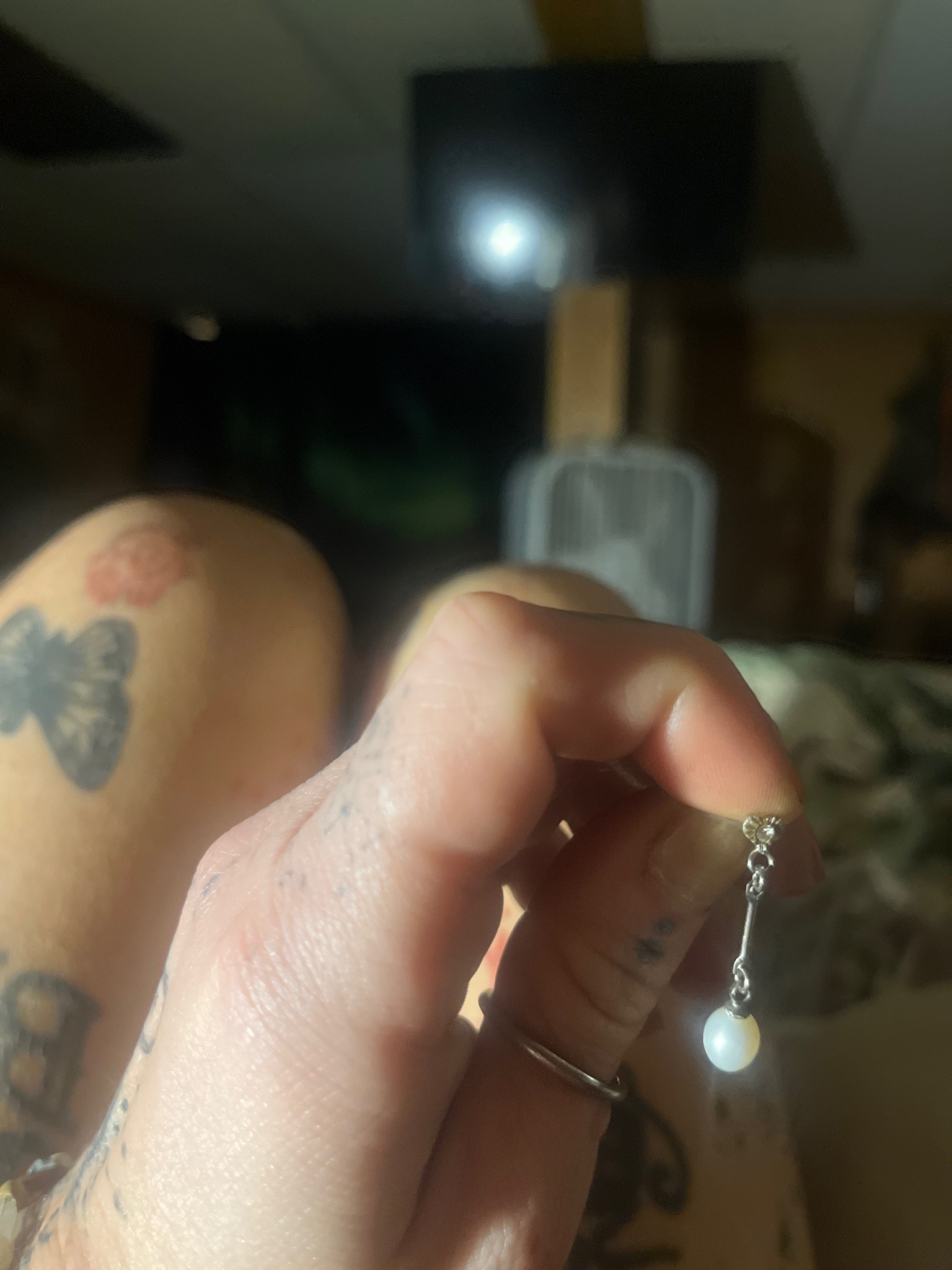 This is a single dangle-style earring featuring a spherical white cultured pearl suspended by a delicate white metal chain and bar assembly. The pearl exhibits a creamy white body color with subtle silvery-pink overtones and a medium luster. It measures approximately 6-7mm in diameter. The metal components appear to be silver-toned, possibly sterling silver, white gold, or a rhodium-plated alloy, though no hallmarks are visible in the provided image. The construction consists of a small circular stud set with a minute clear faceted stone (possibly a diamond or cubic zirconia), from which hangs a rigid metal bar connected by jump rings. The earring terminates in an articulated pearl drop. Overall, the piece displays a classic, late 20th-century aesthetic common in bridal or formal jewelry. The condition appears fair to good; the pearl surface shows some minor surface irregularities, and the metal shows light signs of wear consistent with age. There is no visible sign of heavy tarnish or oxidation, suggesting the item has been well-maintained or recently cleaned. The craftsmanship is of standard commercial quality with secure jump ring connections and a traditional peg-and-glue mounting for the pearl.