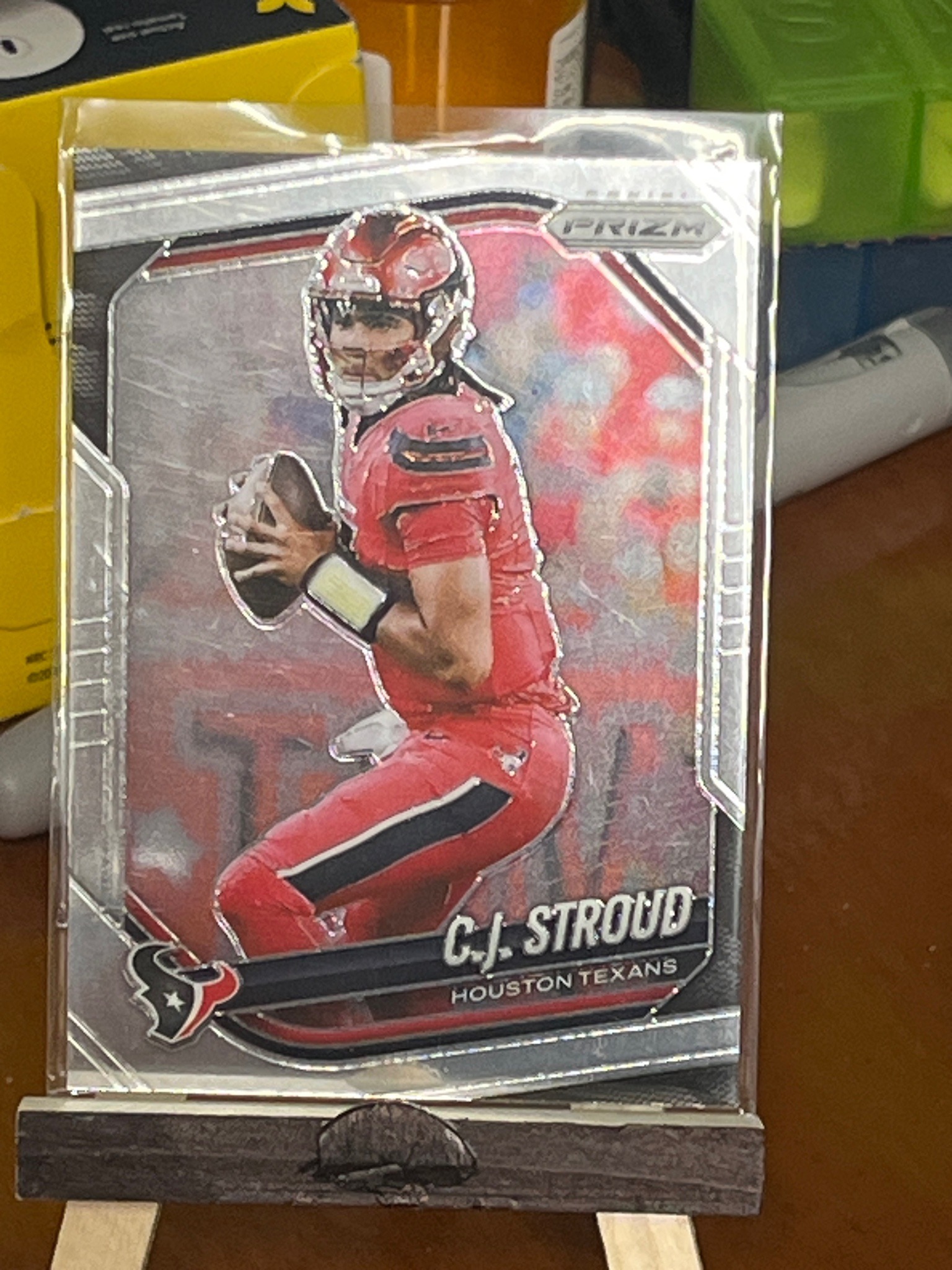 This is a 2023 Panini Prizm football trading card featuring Houston Texans quarterback C.J. Stroud. The card is a standard 2.5 by 3.5 inches, constructed from thick cardstock with a high-gloss, metallic 'Prizm' finish that provides a reflective, prismatic effect when held to the light. The design features a centered image of Stroud in his red Texans home uniform, set against a blurred stadium background with a dominant silvery-grey border. The 'Prizm' logo is located in the upper right corner, and the Houston Texans logo is at the bottom left alongside the nameplate. The card is currently housed in a protective clear plastic sleeve and displayed on a small wooden stand. Notable features include the crisp typography of the player's name and team and the characteristic paneled border design of the 2023 Prizm set. Condition-wise, the centering appears relatively balanced from left to right, though the card shows some visible surface scuffing and scratches on the clear plastic sleeve which may or may not affect the card surface underneath. The corners and edges, viewed through the sleeve, appear sharp with no immediate signs of white chipping or soft blunting. This card represents a key rookie asset from the 2023 NFL season, making it a highly desirable modern collectible.