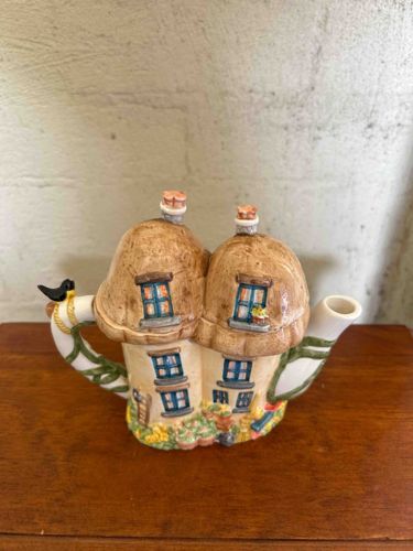 This is a highly decorative, small-scale teapot from the Leonardo Collection, designed in a whimsical 'cottage core' style. The piece is crafted from glazed ceramic and shaped to resemble a pair of adjoining thatched-roof cottages. Its primary colors include cream for the walls, tan and brown for the textured thatch, and blue for the window panes. The handle and spout are cleverly integrated into the design as climbing vines with green leaves, and a small black bird perched near the top of the handle serves as a charming detail. The base is decorated with delicate molded flowers and garden elements, adding to its pastoral aesthetic. Two chimneys at the top of the lids act as handles for the openings. The craftsmanship shows attention to detail in the molded textures of the roof and the painted window frames. Condition-wise, the item appears to be in good vintage condition with no visible cracks or heavy chips from this angle, though a light crazing or minor patina might be expected given its likely manufacturing date in the late 20th century (circa 1980s-1990s). It serves as both a functional teapot and a popular collectible figurine.