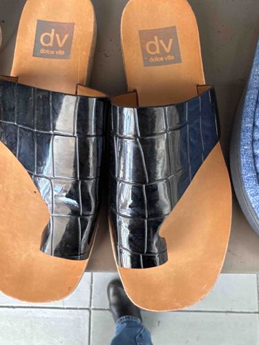 A pair of contemporary women's slide sandals featuring a notable toe-loop design and asymmetrical vamp straps. The upper material is a high-shine, black synthetic or patent leather with a distinct crocodile-embossed texture, providing a sophisticated, textured appearance. The footbed is a light tan, contoured synthetic material designed for comfort, prominently featuring the 'dv dolce vita' brand logo stamped in a square at the heel area. The construction includes a flat or low-platform sole with a wood-grain or cork-like aesthetics visible at the sides. These sandals represent a modern fashion style, likely manufactured within the last 5-7 years as part of the brand's accessible luxury diffusion line. Notably, the left shoe shows significant creasing and structural collapse on the side of the strap, suggesting moderate previous wear and potential loss of material integrity. There are minor abrasions visible along the edges of the footbeds and some dust accumulation, consistent with pre-owned condition in a retail or storage environment. The craftsmanship is typical of mass-market fashion brands, utilizing glued construction and synthetic materials to mimic higher-end exotic leathers.