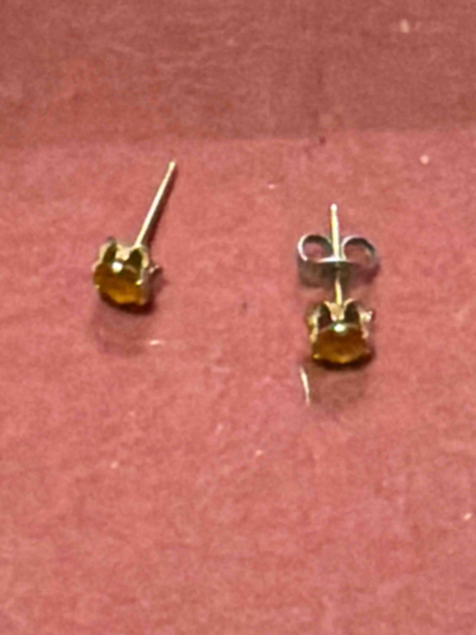 A pair of stud-style earrings featuring round-cut yellow gemstones, possibly citrine or yellow topaz, securely held within six-prong basket settings. The settings and posts appear to be made of gold-tone metal, which could be solid gold, gold-filled, or gold-plated base metal depending on hallmarking which is not visible in this image. The gemstones exhibit a deep amber or golden hue with noticeable internal reflections, suggesting they are faceted stones. One earring is shown with its friction-style butterfly back (scroll back) still attached to the post, while the other earring has the post fully exposed. The posts are straight and appear to be of standard ear-piercing gauge. Regarding condition, the metal shows a reflective surface with no immediate signs of heavy oxidation or plating loss, though minor surface scratches may be present from use. The prong work appears symmetrical, keeping the stones centered. Given the classic six-prong design, these items represent a timeless style common in jewelry manufacturing from the late 20th century to the present day. Note that the authenticity of the stones and the metal purity would require professional testing with a jeweler's loupe and acid test or XRF spectrometer for a definitive valuation.