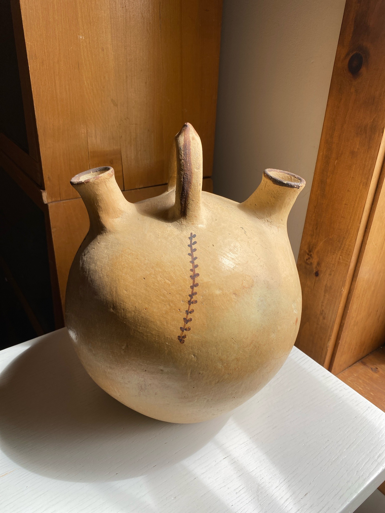 This item is a handcrafted terracotta vessel, likely a Spanish botijo or similar Mediterranean water jug, dating from the mid-20th century. It features a spherical, bulbous body made of buff-colored earthenware with an unglazed, buff-matte finish that shows signs of hand-burnishing. The unique construction includes three protrusions from the top: two functional pouring/filling spouts with flared rims and a central arched handle. The primary decorative element is a vertical, hand-painted sprig or vine motif in dark manganese or iron oxide pigment, running down the center of the body aligned with the handle. There is additional dark pigment detailing along the spine of the handle and circling the rims of the spouts. Physically, the vessel exhibits signs of traditional pinch and coil construction, resulting in slight asymmetrical nuances. The condition shows age-appropriate wear, including small surface pits, light abrasions, and a natural patina from handling. There are no significant cracks or large chips visible, indicating it has been well-preserved. The craftsmanship is characteristic of regional European or Latin American folk pottery, prioritizing functional thermal cooling properties alongside simple, elegant geometric forms.