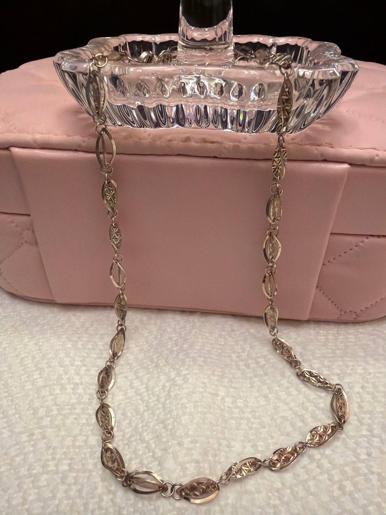 This item is a vintage-style decorative chain necklace characterized by a sequence of alternating marquise-shaped links. The chain appears to be constructed from a light-colored metal, likely silver-tone alloy or sterling silver, featuring two distinct link designs: an open, pointed oval frame and a solid marquise-shaped link with an intricate, stamped geometric starburst or sunburst filigree pattern. The links are connected by small circular jump rings, suggesting a mid-20th-century costume jewelry construction or a later piece imitating Mid-Century Modern aesthetics. The metal exhibits a soft, aged patina with minor surface tarnish visible in the recessed areas of the patterned links, which adds depth to the design. No prominent maker's marks or hallmarks are visible in the primary view, though such marks would typically be located near the clasp or on a small end tag. The overall condition appears good with functional link integrity and no apparent breaks or heavy oxidation. The light-catching properties of the stamped pattern indicate a level of mass-production craftsmanship common in mid-tier jewelry of the 1950s-1970s. Its delicate yet structured geometry makes it a classic accessory from the retro to modern eras.