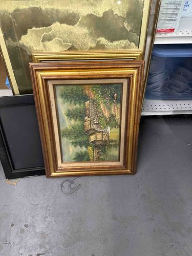 This item is a small-to-medium-sized landscape oil painting, characteristic of mid-20th-century decorative art. The composition features a rustic log cabin nestled among evergreen trees and foliage, likely depicting a North American mountain or woodland scene. The painting is executed on a rectangular canvas or panel, currently displayed in a vertical orientation. It is housed in a substantial, multi-tiered gilded wood or molded composite frame with a prominent linen liner. The frame features a gold-toned finish with some visible antiquing or dark patina in the recessed moldings, suggesting a traditional or 'Traditionalist' style from approximately the 1970s. Physically, the piece shows signs of age and prior display; there are visible scuffs and minor losses to the gold finish on the outer edges and corners of the frame. The linen liner appears slightly discolored or aged, which is common for pieces of this era. The painting itself utilizes a muted color palette consisting primarily of earthy greens, browns, and soft blues in the sky. While a signature is not clearly legible in the image, it is located in the bottom right corner (oriented horizontally). The brushwork is impressionistic and relatively thick, indicating a mass-produced studio piece rather than a fine art original by a renowned master. Overall craftsmanship is typical of commercial gallery art intended for home decor, showing sturdy construction but standard materials.