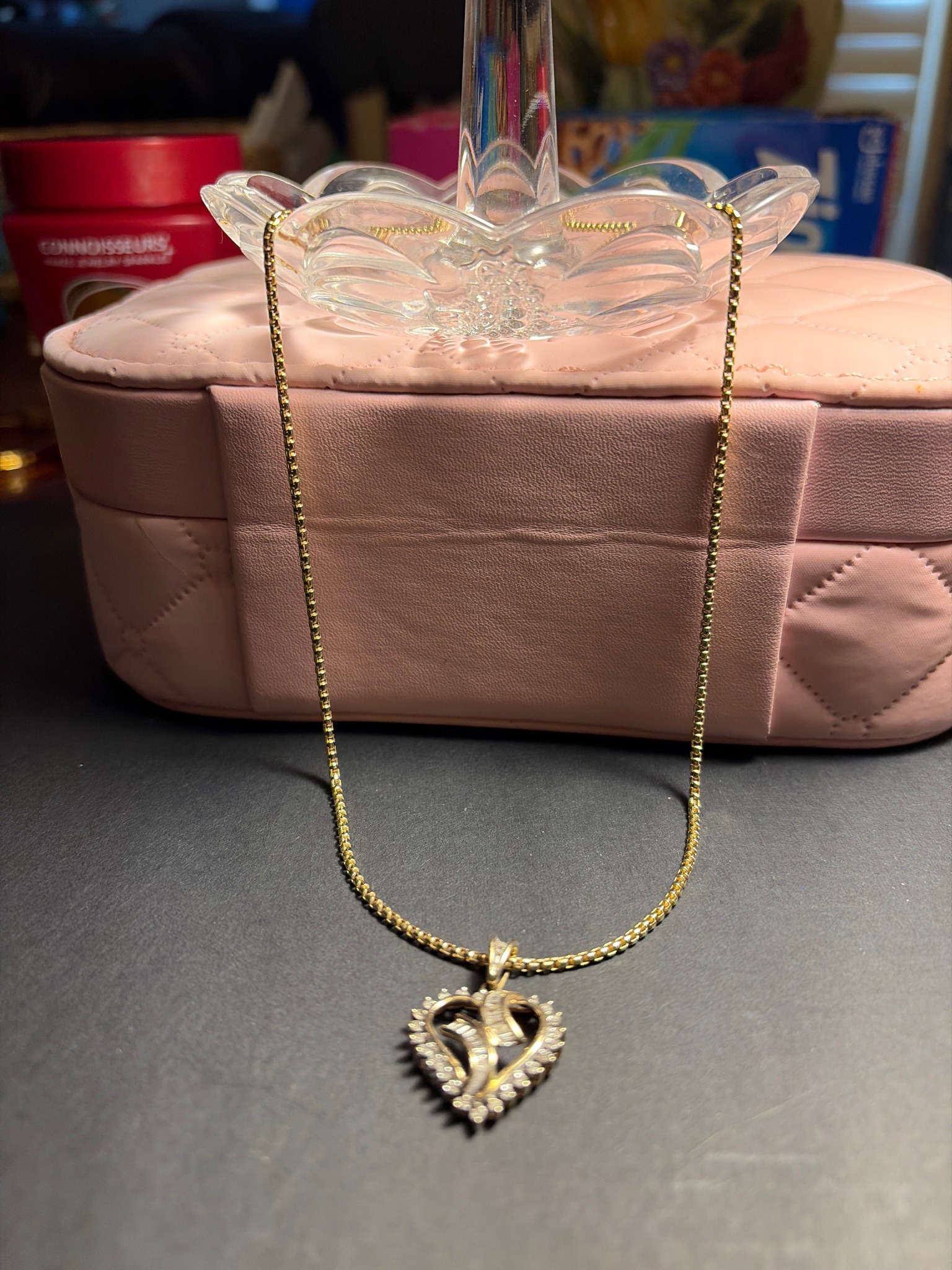 This piece of fine jewelry features a decorative open-work heart pendant suspended from a vibrant yellow gold-tone box link chain. The pendant displays a two-tone aesthetic, crafted with a yellow gold frame and accented by white metal elements—likely rhodium-plated sterling silver or white gold. The outer border and central ribbon-like scroll are pavé-set with numerous small, round-cut clear gemstones, which appear to be either diamonds or high-quality cubic zirconia. The pendant is attached via a tapered, polished bail that allows it to slide freely along the chain. The chain itself is a classic box-style construction, offering a sturdy yet flexible drape with a rich yellow gold luster. Regarding condition, the piece appears well-maintained with no missing stones or significant kinks in the chain visible. There is some minor surface patina or tarnish visible on the underside of the pendant bails and along the inner decorative scrolls, typical of light wear. The style is contemporary, likely dating from the early 21st century, and reflects a modern romantic design. The craftsmanship is clean, with distinct settings for each stone and a symmetrical heart shape, indicating commercial fine jewelry quality.