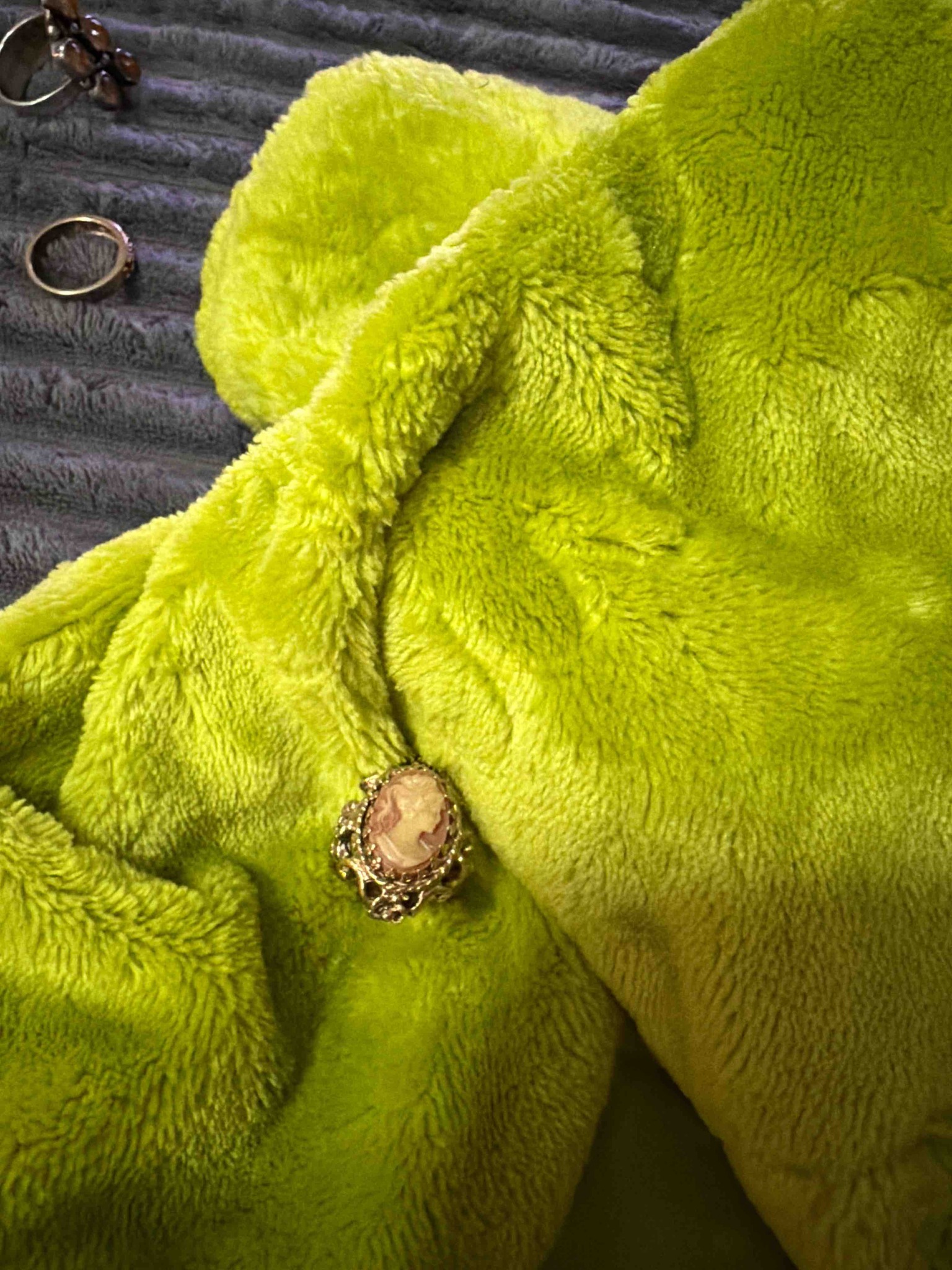 This item is a vintage-style cameo ring featuring a hand-carved shell relief of a classic female profile. The central cameo is oval in shape, displaying a delicate cream-colored figure set against a light coral or salmon-colored background, characteristic of genuine carnelian conch shell carving. The bust depicts a woman with upswept wavy hair and a floral accent, a hallmark of traditional Italian craftsmanship. The cameo is securely held in an ornate gold-toned metal setting, likely gold-filled or plated brass, which features a decorative scalloped or wire-work bezel that adds substantial volume to the ring's design. The craftsmanship reflects a mid-20th-century aesthetic, possibly 1950s-1970s, mimicking earlier Victorian floral and portrait trends. Regarding condition, there appears to be significant wear on the metal finish, showing signs of tarnish and loss of gilding on the high points of the ornate setting, which is typical for costume decorative pieces of this age. No major chips are visible on the shell, though a fine patina is present. The ring is photographed resting on a bright chartreuse green faux-fur textile, highlighting its warm tones through high contrast.