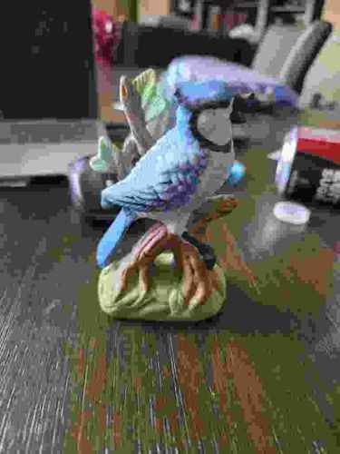 This is a decorative porcelain figurine depicting a Blue Jay perched upon a textured, naturalistic branch. The piece is crafted from bisque-fired porcelain, giving it a matte, non-reflective finish typical of realistic bird figurines from the mid-to-late 20th century. The blue jay is rendered with a light blue back, transitioning to darker indigo highlights on the wing tips and tail feathers, with a white underbelly and the species' characteristic black collar around the throat. The base consists of a multi-toned brown branch anchored to a moss-green ground. The construction features intricate molding to simulate feather textures and the rough bark of the wood. The craftsmanship suggests a mid-market collectible quality, similar to those produced by companies like Lefton, Enesco, or Homco during the 1970s or 1980s. While no specific maker's mark is visible on the underside in this view, the style is highly representative of Japanese-imported giftware. The item appears to be in good vintage condition with no immediate chips or cracks visible, although some light surface dust indicates long-term display. The anatomical proportions are stylized yet recognizable, serving as a classic example of wildlife-themed home décor from the late 20th-century style period.
