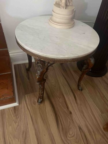 This is a circular side table featuring a white Carrara-style marble top set into a decorative giltwood and gesso frame. The marble surface displays subtle grey veining and an ogee-edge profile. Below the top, the apron is decorated with a continuous beaded or egg-and-dart molding. The table is supported by four cabriole legs, which are heavily ornamented with acanthus leaf carvings and scrollwork at the knees, terminating in small pad or whorl feet. The overall style is consistent with late 19th or early 20th-century Neoclassical or Louis XV Revival furniture. Physically, the item shows significant signs of age and wear; the original gilding has heavily distressed, revealing the white gesso and dark wood or clay bole underneath, particularly on the prominent carved sections of the legs. This finish loss creates a shabby-chic or weathered aesthetic. There are no clearly visible maker's marks from this angle, but the complexity of the carvings suggests mid-to-high quality craftsmanship of its era. The wood appears to be a fruitwood or beech common for gilded pieces. Condition is fair, requiring conservation if a pristine look is desired, though the current distressed state is also a popular decorative style.